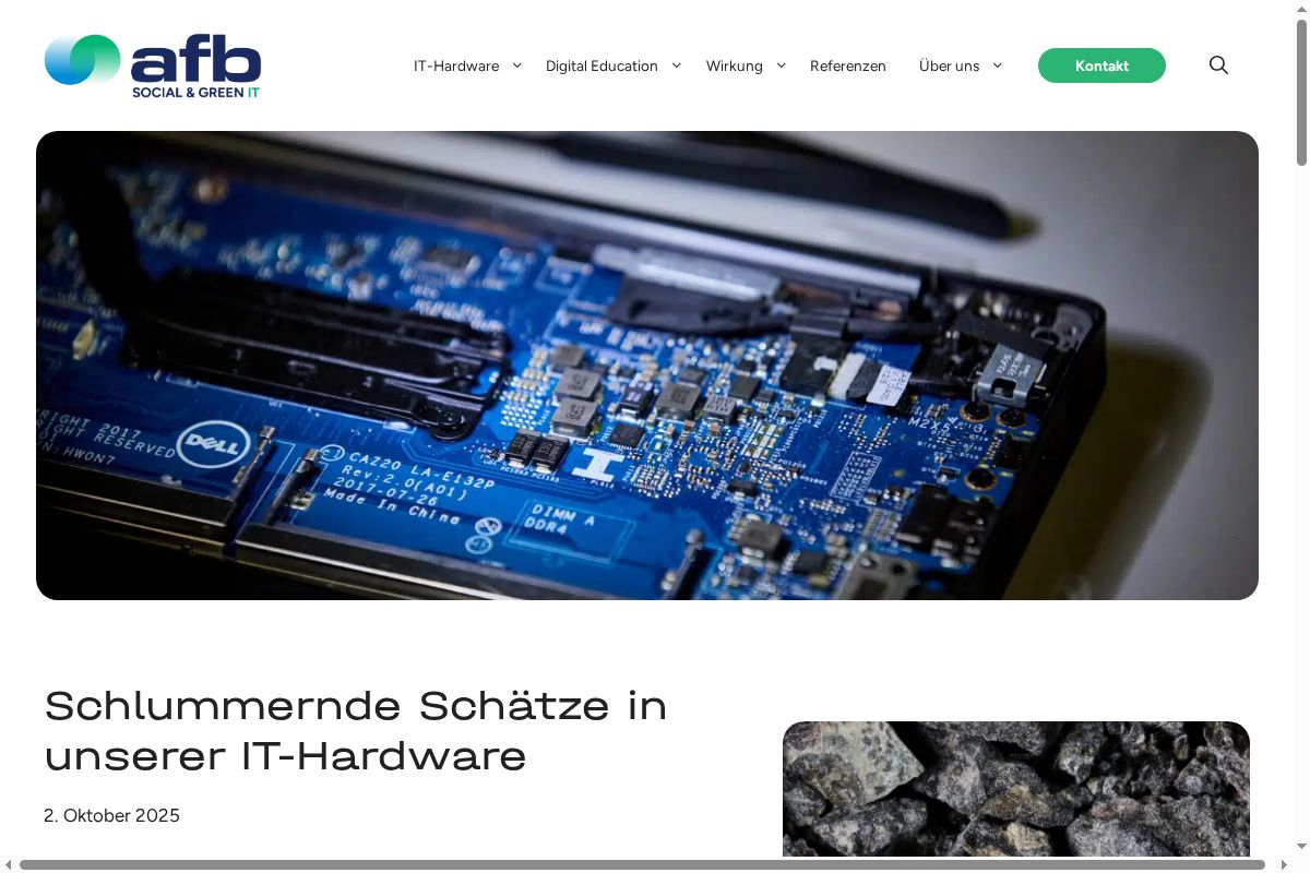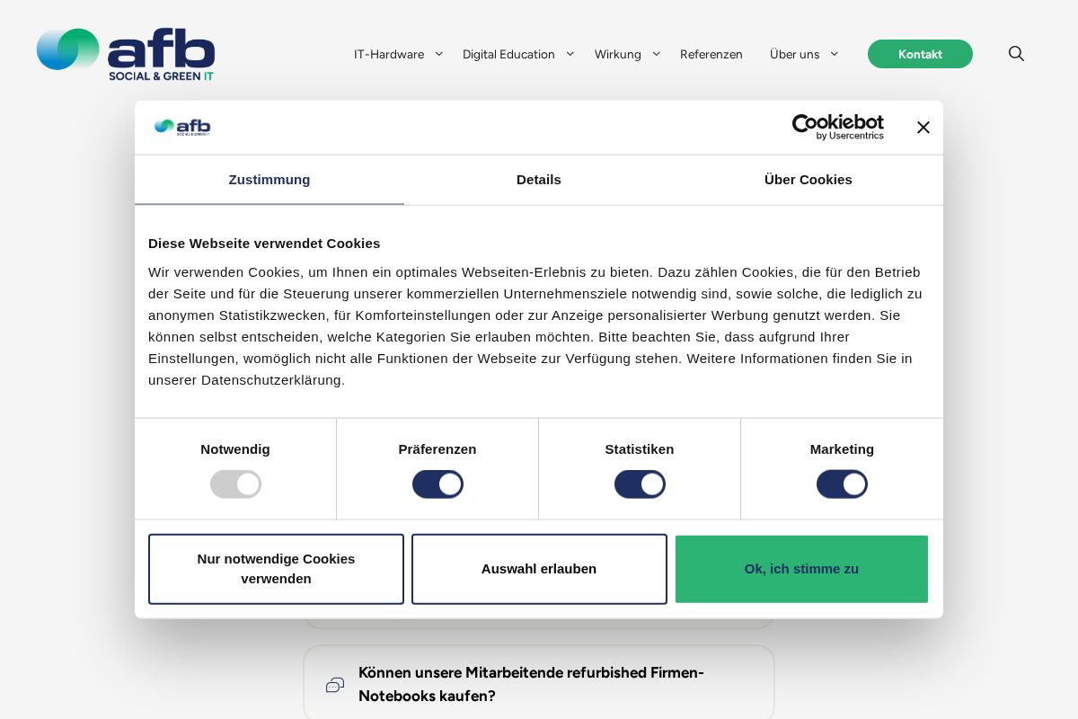 Zum Inhalt springen Menü Menü IT-Hardware Verkaufen an afb IT-Transport Datenvernichtung Refurbishment & Recycling Kaufen von afb Privatkunden Gewerblich Digital Education Schulen & Bildungsträger Klassensatz-IT Schul-IT Elternportal Bestell