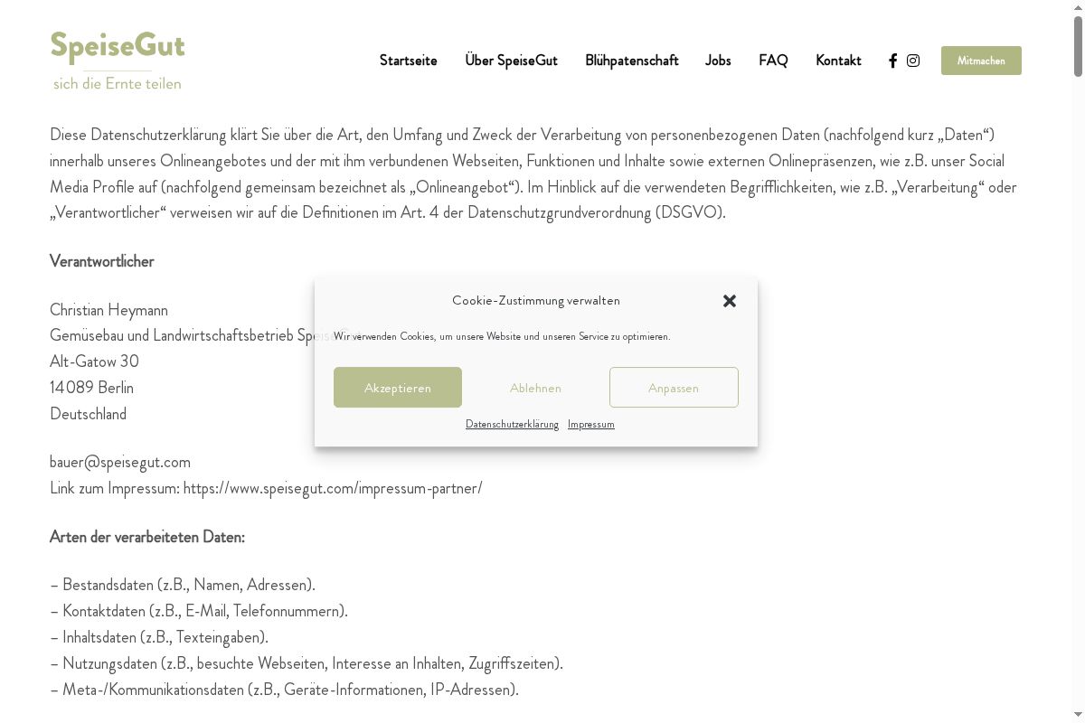 Startseite Über SpeiseGut Blühpatenschaft Jobs FAQ Kontakt Mitmachen Menu Close Diese Datenschutzerklärung klärt Sie über die Art, den Umfang und Zweck der Verarbeitung von personenbezogenen Daten (nachfolgend kurz „Daten“) innerhalb unseres Onlinea