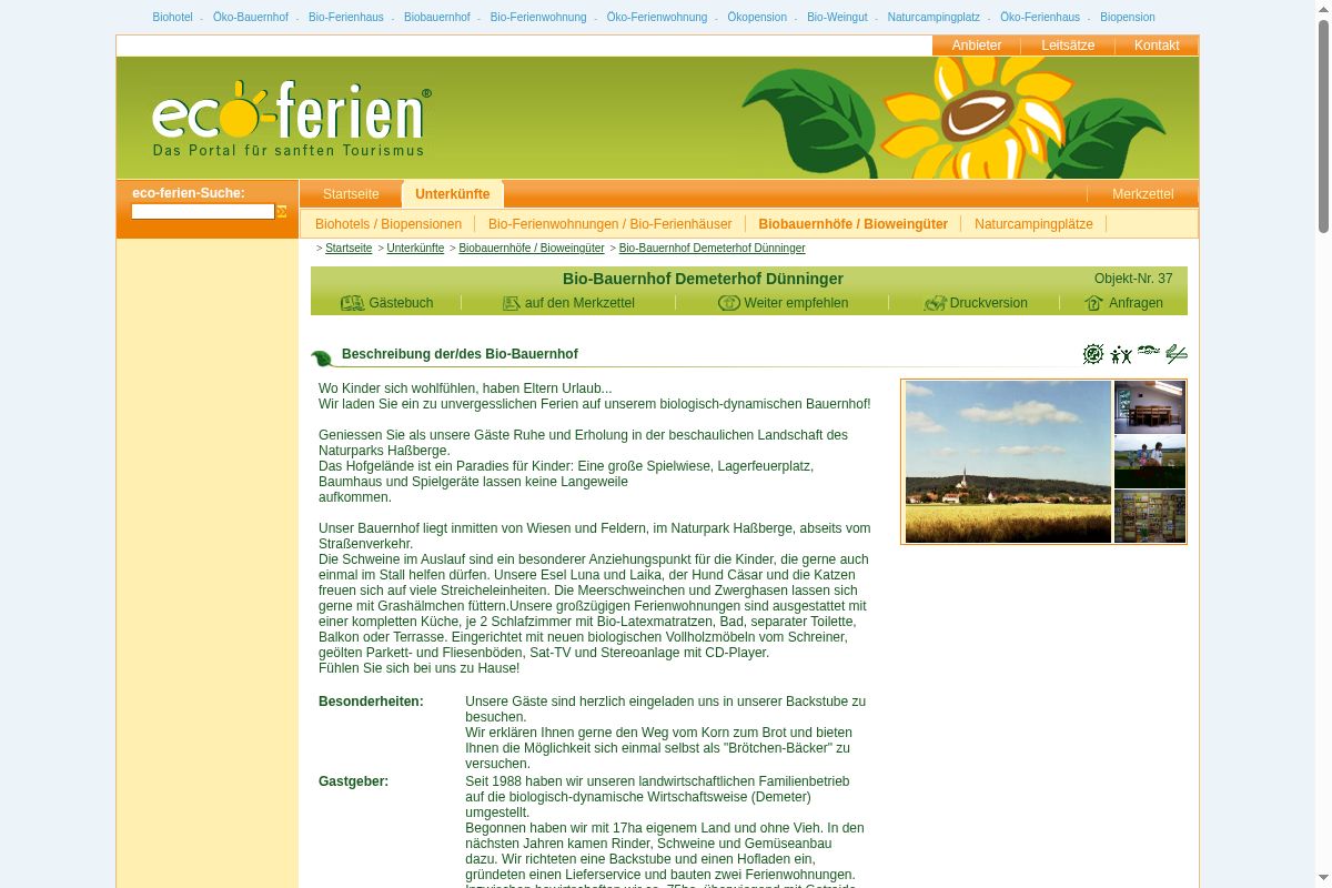Biohotel - Öko-Bauernhof - Bio-Ferienhaus - Biobauernhof - Bio-Ferienwohnung - Öko-Ferienwohnung - Ökopension - Bio-Weingut - Naturcampingplatz - Öko-Ferienhaus - Biopension Anbieter Leitsätze Kontakt eco-ferien-Suche: Startseite Unterkünfte Merkzet